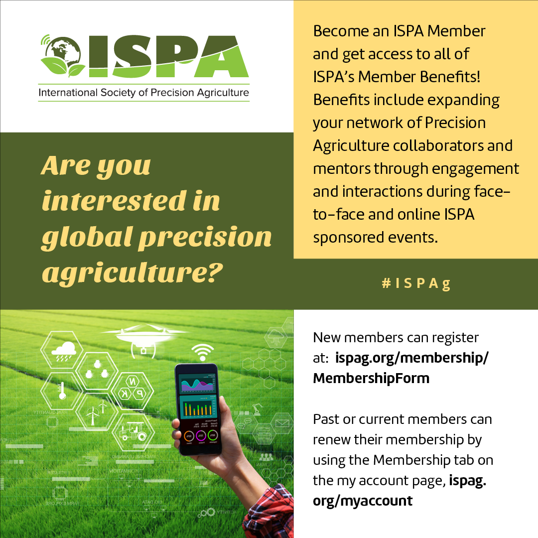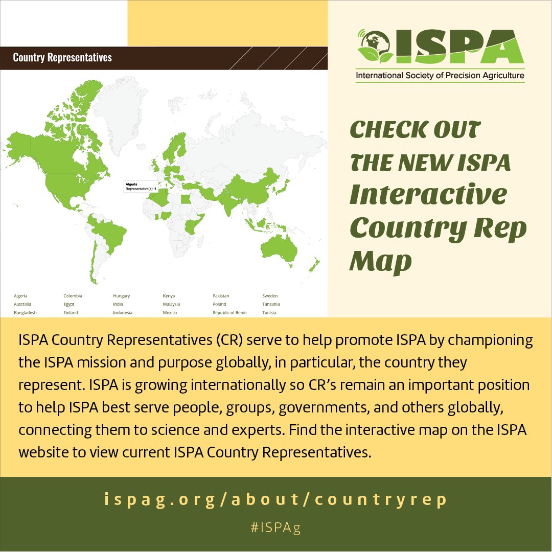 If you are interested in becoming a Country Representative, please email info@ispag.org with your bio highlighting your experience in precision agriculture and your CV. ISPA requires that all Country Representatives are current members of the society. To become a member, please complete the membership form.