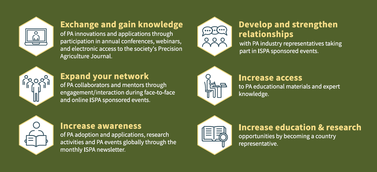 I am reaching out about renewing your ISPA membership for the coming year. There have been several new membership benefits over the past year including an enhanced My Account page which allows you to quickly and easily join ISPA communities that align with your interests. We have also developed a new database of Precision and Digital Ag courses being taught globally. Finally, our monthly newsletter provides up to date information and announcements on Precision Agriculture topics and events.